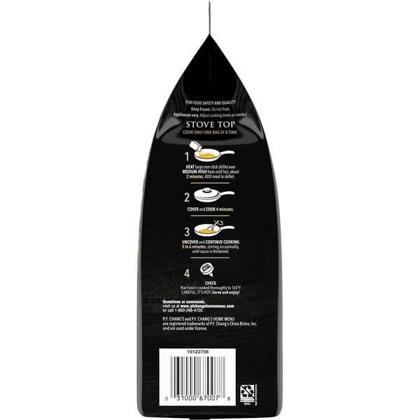 Stove Top: Cook only one bag at a time. 1. Heat large non-stick skillet over medium-high heat until hot, about 2 minutes. Add meal to skillet. 2. Cover and cook 4 minutes. 3. Uncover and continue cooking 5 to 6 minutes, stirring occasionally, until sauce is thickened. 4. Check that food is cooked thoroughly to 165 degrees F. Careful, it’s hot! Serve and enjoy! For food safety and quality. Keep frozen. Do not thaw. Appliances vary. Adjust cooking times as needed.
