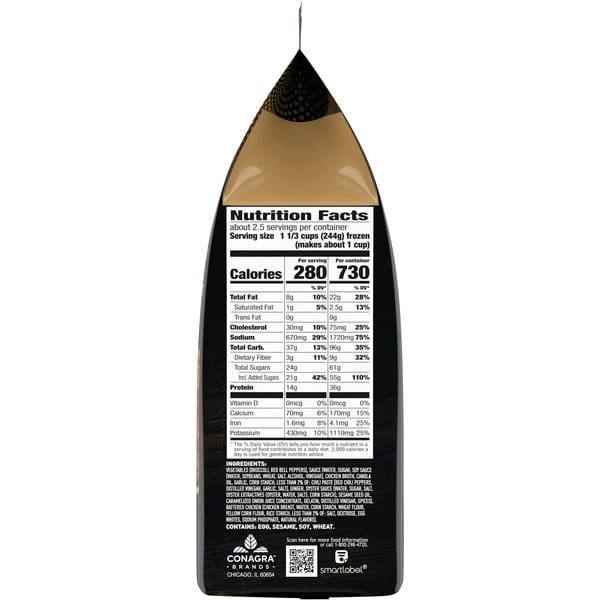 Vegetables (broccoli, Red Bell Peppers), Sauce (water, Sugar, Soy Sauce [water, Soybeans, Wheat, Salt, Alcohol, Vinegar, Lactic Acid], Chicken Broth, Canola Oil, Garlic, Modified Corn Starch, Less Than 2% Of: Chili Paste [red Chili Peppers, Distilled Vinegar, Garlic, Salt], Ginger, Oyster Sauce [water, Sugar, Salt, Oyster Extractives {oyster, Water, Salt}, Corn Starch], Sesame Seed Oil, Caramelized Onion Juice Concentrate, Gelatin, Distilled Vinegar, Spice), Battered Chicken (chicken Breast, Water, Corn Starch, Wheat Flour, Yellow Corn Flour, Rice Starch, Less Than 2% Of: Salt, Dextrose, Egg Whites, Sodium Phosphate, Natural Flavors).