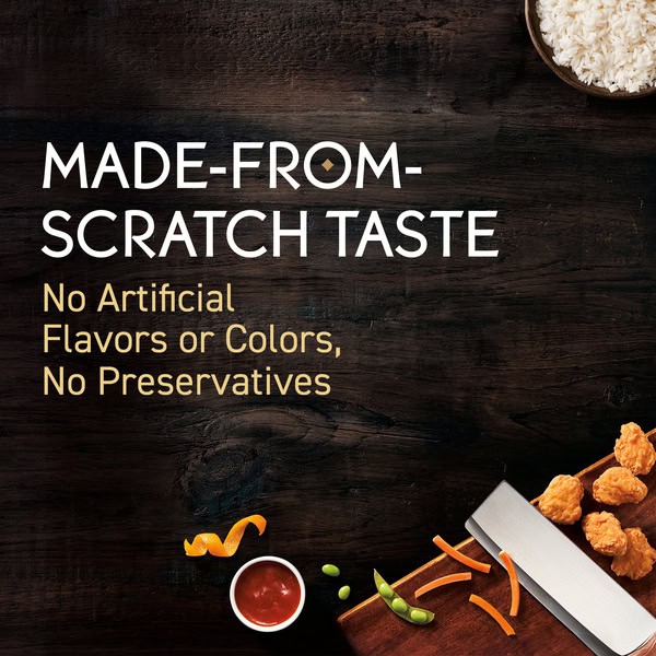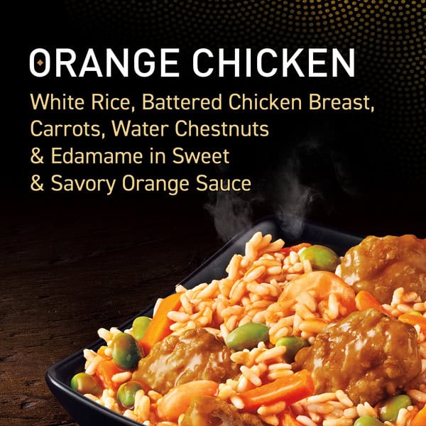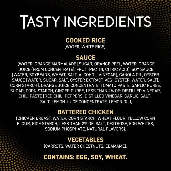 Cooked Rice (water, White Rice), Sauce (water, Orange Marmalade [sugar, Orange Peel, Water, Orange Juice {from Concentrate}, Fruit Pectin, Citric Acid], Soy Sauce [water, Soybeans, Wheat, Salt, Alcohol, Vinegar], Canola Oil, Oyster Sauce [water, Sugar, Salt, Oyster Extractives {oyster, Water, Salt}, Corn Starch], Orange Juice Concentrate, Tomato Paste, Garlic Puree, Sugar, Corn Starch, Ginger Puree, Less Than 2% Of: Distilled Vinegar, Chili Paste [red Chili Peppers, Distilled Vinegar, Garlic, Salt], Salt, Lemon Juice Concentrate, Lemon Oil), Battered Chicken (chicken Breast, Water, Corn Starch, Wheat Flour, Yellow Corn Flour, Rice Starch, Less Than 2% Of: Salt, Dextrose, Egg Whites, Sodium Phosphate, Natural Flavors), Vegetables (carrots, Water Chestnuts, Edamame)