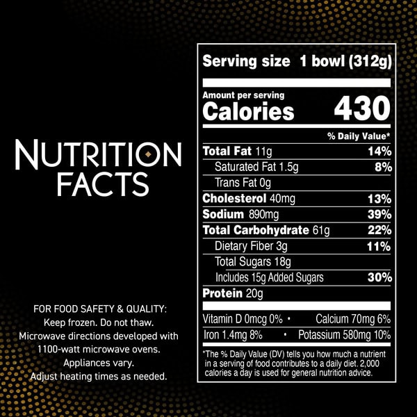 Microwave: Cook only one at a time. Do not cook in conventional or toaster ovens. 1. Microwave on high 2-1/2 minutes. No need to vent film. 2. Stir and replace film. Careful, it’s hot! Microwave an additional 1-1/2 to 2-1/2 minutes. 3. Check that food is cooked thoroughly to 165 degrees F. Chef Tip: Add hot sauce for a delightful kick! Bowl designed for single use only. Do not re-use. For food safety and quality. Keep frozen. Do not thaw. Microwave directions developed with 1100-watt microwave ovens. Appliances vary. Adjust heating times as needed.