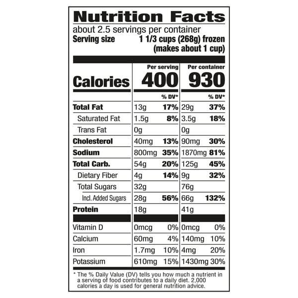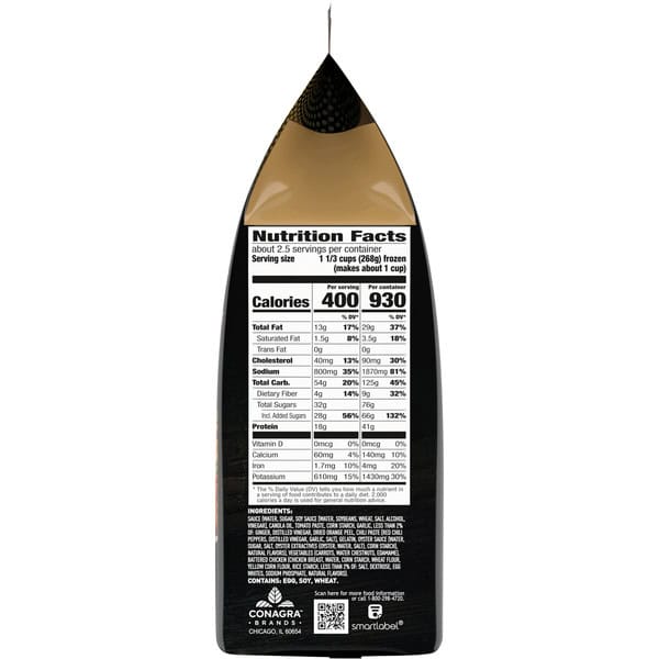 Sauce (water, Sugar, Soy Sauce [water, Soybeans, Wheat, Salt, Alcohol, Vinegar], Canola Oil, Tomato Paste, Corn Starch, Garlic, Less Than 2% Of: Ginger, Distilled Vinegar, Dried Orange Peel, Chili Paste [red Chili Peppers, Distilled Vinegar, Garlic, Salt], Gelatin, Oyster Sauce [water, Sugar, Salt, Oyster Extractives {oyster, Water, Salt}, Corn Starch], Natural Flavors), Vegetables (carrots, Water Chestnuts, Edamame], Battered Chicken (chicken Breast, Water, Corn Starch, Wheat Flour, Yellow Corn Flour, Rice Starch, Less Than 2% Of: Salt, Dextrose, Egg Whites, Sodium Phosphate Natural Flavors]