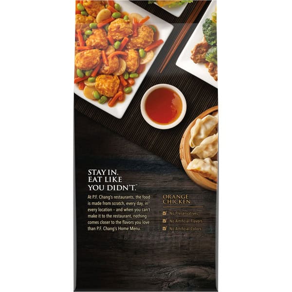 Experience a delicious, restaurant-style dining experience at home with P.F. Chang’s Home Menu Orange Chicken Skillet Meal. Featuring battered chicken breast, carrots, water chestnuts and edamame in spicy orange sauce for frozen meals with authentic Asian food flavor. Made with all natural* chicken, this frozen meal contains no artificial flavors, colors or preservatives, ensuring delicious and satisfying frozen entrees every time. Ideal for family meals when you’re craving something special, these frozen skillet meals provide the gourmet experience of restaurant-quality cuisine in quick frozen meals that can be prepared in the comfort of your home. Simply cook this frozen food on the stove top according to the package instructions for easily prepared meals in minutes. Store this 22 ounce frozen chicken meal kit in your freezer until you’re ready to enjoy. Stay in. Eat like you didn’t. Far from ordinary, P.F. Chang’s Home Menu creates a gourmet Asian experience in your own kitchen. Simple, fresh ingredients balance one another to bring out all the best flavors—that’s how easy Asian food is done.