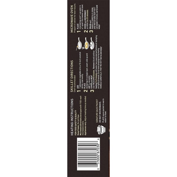 Heating Instructions: For Food Safety & Quality: Keep frozen. Do not thaw. Microwave directions developed with 1100-watt microwave ovens. Appliances vary. Adjust heating time as needed. Skillet Directions: Chef recommended. 1. Add 1 tablespoon vegetable oil to a 10-inch nonstick skillet; coat evenly. 2. Place dumplings in a single layer, seam-side up and add 1/4 cup water. 3. Cover and heat over medium 8 minutes. Remove lid and continue heating 2 to 5 minutes until water has evaporated and bottoms of dumpling are lightly browned. Do not move dumplings during heating. Handle carefully, they’re hot! Serve and enjoy! Microwave Oven: Prepare in skillet for best results. 1. Place 4 dumplings and 1 cup water in a 1-quart microwave-safe bowl. 2. Cover and microwave on high 3 to 3-1/2 minutes. 3. Drain well. Handle carefully; bowl and water are very hot! Let stand 2 minutes; serve and enjoy! Signature Sauce Packet: Do not microwave. Place sauce packet in warm water to thaw.