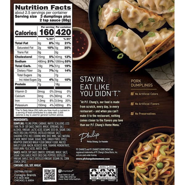 P.F. Chang’s Home Menu Pork Dumplings Frozen Appetizer brings delicious restaurant-inspired food into your home. The frozen dumplings are filled with ground pork, shredded cabbage and sliced scallions. They also include signature sauce so you can dip the dumplings and create the perfect bite. P.F. Chang’s Home Menu Pork Dumplings are made with no artificial colors, flavors or preservatives. Pair the frozen appetizer with P.F. Chang’s Home Menu skillet meals and rice for a perfect Asian-inspired dining experience at home. The frozen pork dumplings are great for enjoying by themselves as an appetizer before a meal, but they also make an excellent addition to your dinner whenever you want something special. Cook the frozen snacks in a skillet in 10 to 13 minutes or in the microwave in 3 to 3 1/2 minutes. Keep the box of frozen dumplings in the freezer and do not thaw. Stay in. Eat like you didn’t.