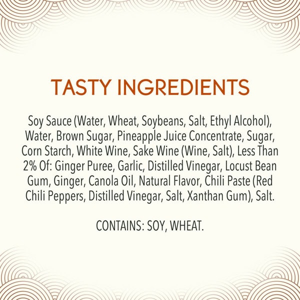 Soy Sauce (water, Wheat, Soybeans, Salt, Ethyl Alcohol), Water, Brown Sugar, Pineapple Juice Concentrate, Sugar, Modified Corn Starch, White Wine, Sake Wine (wine, Salt), Less Than 2% Of: Ginger Puree, Garlic, Distilled Vinegar, Ginger, Canola Oil, Chili Paste (red Chili Peppers, Distilled Vinegar, Salt), Natural Flavor, Salt