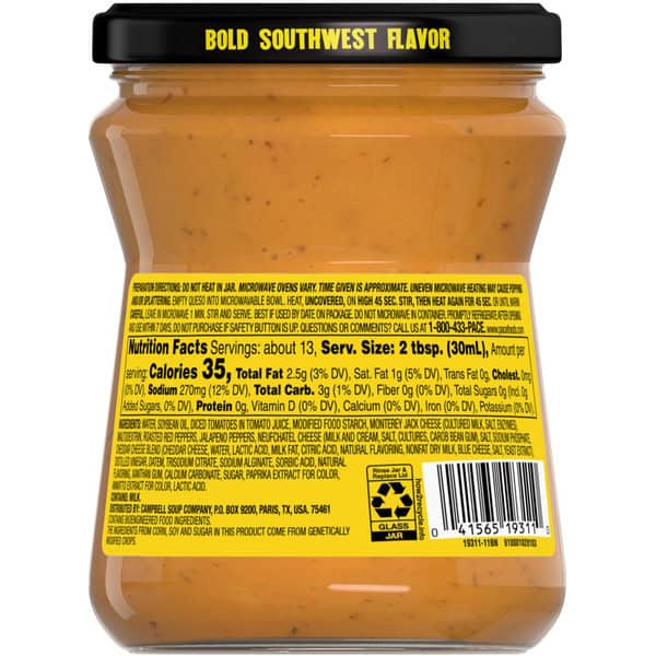 Water, Soybean Oil, Diced Tomatoes In Tomato Juice, Modified Food Starch, Monterey Jack Cheese (cultured Milk, Salt, Enzymes), Maltodextrin, Roasted Red Peppers, Jalapeno Peppers, Neufchatel Cheese (milk And Cream, Salt, Cultures, Carob Bean Gum), Salt, Sodium Phosphate, Cheddar Cheese Blend (cheddar Cheese, Water, Lactic Acid, Milk Fat, Citric Acid, Natural Flavoring, Nonfat Dry Milk, Blue Cheese, Salt, Yeast Extract), Distiled Vinegar, Datem, Trisodium Citrate, Sodium Alginate, Sorbic Acid, Natural Flavoring, Xanthan Gum, Calcium Carbonate, Sugar, Paprika Extract For Color, Annatto Extract For Color, Lactic Acid
