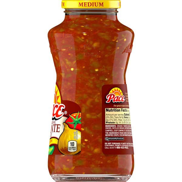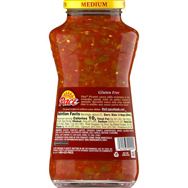 Pace® Medium Picante Sauce will add that kick to any ordinary meal whether it’s dinner time or snacks with friends and family. Tomatoes, chunks of savory onions and hand-picked jalapeños are smoothly blended together for an unforgettable taste. Complement your favorite chicken, beef, pork and fish dishes or keep it simple as a dipping sauce.,