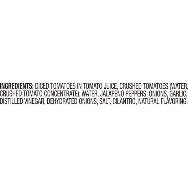 Diced Tomatoes In Tomato Juice, Crushed Tomatoes (water, Crushed Tomato Concentrate), Water, Jalapeno Peppers, Onions, Garlic, Distilled Vinegar, Dehydrated Onions, Salt, Cilantro, Natural Flavoring.