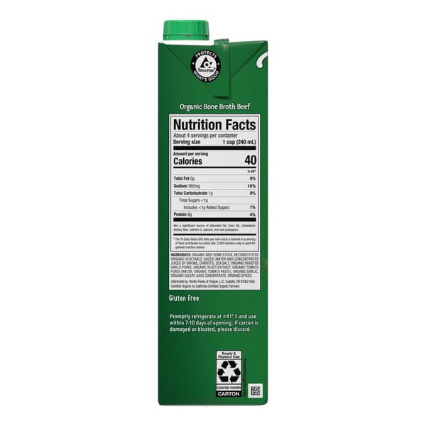 Experience layers of nourishing flavor with Pacific Foods® Organic Beef Bone Broth. We slow-simmer organic beef bones and vegetables for a savory bone broth that’s full of naturally occurring collagen. Sip a cup of warm beef bone broth instead of coffee or tea for a delicious, satisfying addition to your everyday routine. It’s great for refueling after workouts, beating the afternoon slump, or relaxing in the evening. Just pour, heat and enjoy! For an even better sipping experience, season with cracked black pepper and fresh herbs. Our USDA-certified organic bone broth is made from non-GMO ingredients and free of gluten. Each 1-cup serving of Pacific Foods® Organic Beef Bone Broth contains 8 grams of protein, 1 gram of carbs, 0 grams of fat and 40 calories. One 32 oz recyclable carton contains roughly 4 servings. In addition to drinking it as a traditional sipping broth, you can use this bone broth in any recipe that calls for beef broth, beef stock or water. Try it as a stew or soup base, to enhance gravies and sauces, or to cook grains and veggies. At Pacific Foods®, we’re dedicated to making the most nourishing foods possible from simple, carefully sourced ingredients.
