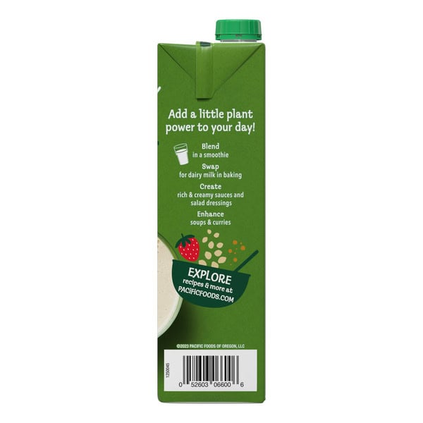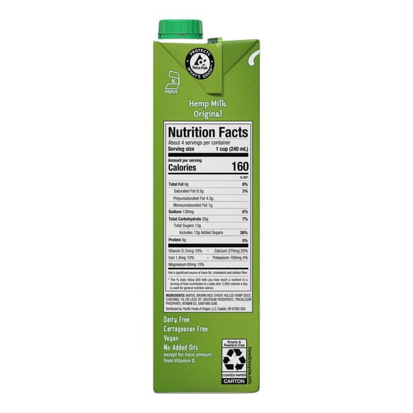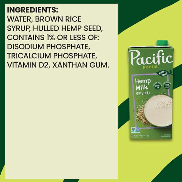 Add a little plant power to your day with Pacific Foods® Original Hemp Milk. Made from hemp seed, this plant based milk alternative has a smooth and creamy texture and a uniquely nutty flavor. It’s a versatile lactose free milk substitute that can be enjoyed by the glass or used in a variety of recipes. Blend this non dairy milk alternative in smoothies, swap it for dairy milk when baking, or use it to enhance soups and curries. It’s also great for creating rich and creamy sauces and salad dressings. Made with non-GMO ingredients and rich in plant based nutrients, this vegan milk substitute is an excellent source of omega 3 ALA and a good source of calcium, magnesium and vitamin D per 1-cup serving. Each 32 oz shelf-stable carton contains approximately 4 servings of our hemp-based dairy free milk alternative and is specially designed to lock in flavor. In addition to hemp seed milk, Pacific Foods® also offers plant based milk alternatives made with almonds, oats, coconut and cashews. At Pacific Foods®, we’re dedicated to making the most nourishing foods possible from quality, carefully sourced ingredients.