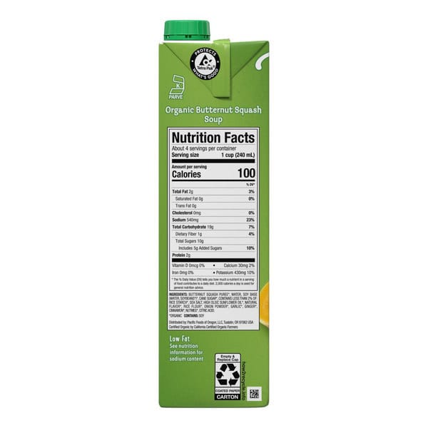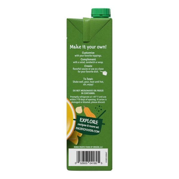 Immerse your taste buds into something truly unique with Pacific Foods® Organic Butternut Squash Soup. Smooth and savory, this USDA Organic soup is consciously crafted with non-GMO ingredients, including fall-harvested butternut squash that’s simmered slowly to bring out its natural sweetness. Ginger, onion, and garlic mingle with cinnamon and nutmeg to round out the flavor, creating a plant based, vegan soup with a hint of nuttiness. Low in fat with 2 grams per serving, this gluten free soup makes it easy to be intentional about the way you stock your pantry. Enjoy it on its own as a quick and easy vegan snack, customize it with your favorite toppings, or pair it with a salad, sandwich, or wrap. You can also use it to create flavorful sauces or as a base for your favorite side dish. Each 32 oz resealable carton contains about 4 servings of deliciously simple vegetable soup. To prepare, simply pour, heat until hot, stir, and enjoy. In addition to Butternut Squash, Pacific Foods® offers Cashew Carrot Ginger, Creamy Tomato, and more. At Pacific Foods®, we’re dedicated to making the most nourishing foods possible from simple, carefully sourced ingredients.