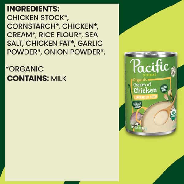 Immerse your taste buds into something truly unique with Pacific Foods® Organic Cream of Chicken Soup. An old-fashioned condensed soup with a modern twist, this canned soup is a savory blend of roasted chicken, cream and garlic. Enjoy this gluten free soup on its own as a quick and easy snack, customize it with your favorite toppings, or pair it with a salad, sandwich or wrap. You can also use it in recipes like homemade soups and casseroles. USDA-certified organic and made with non-GMO ingredients, this chicken soup is gluten free and made without additives and preservatives. Each 10.5 oz can contains about 2.5 servings of soup. To prepare, simply pour, add 1 can of milk, heat until hot, stir and enjoy. Every spoonful of our organic soup is satisfying to the last drop.