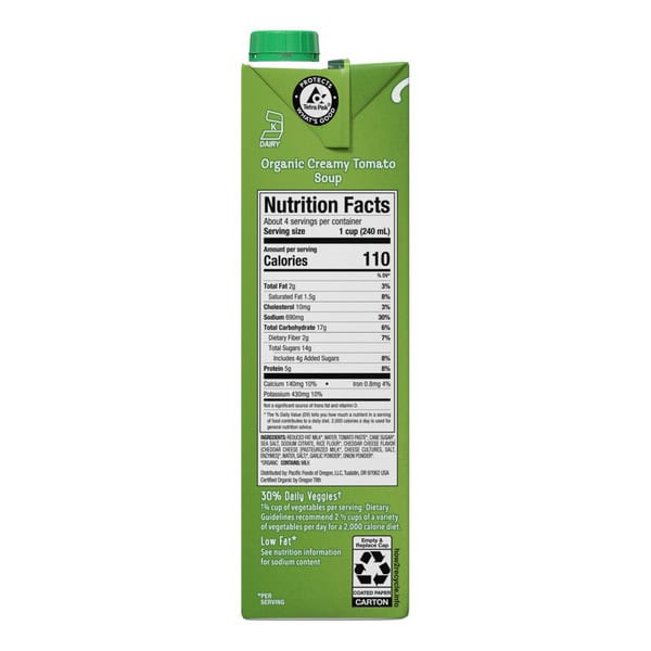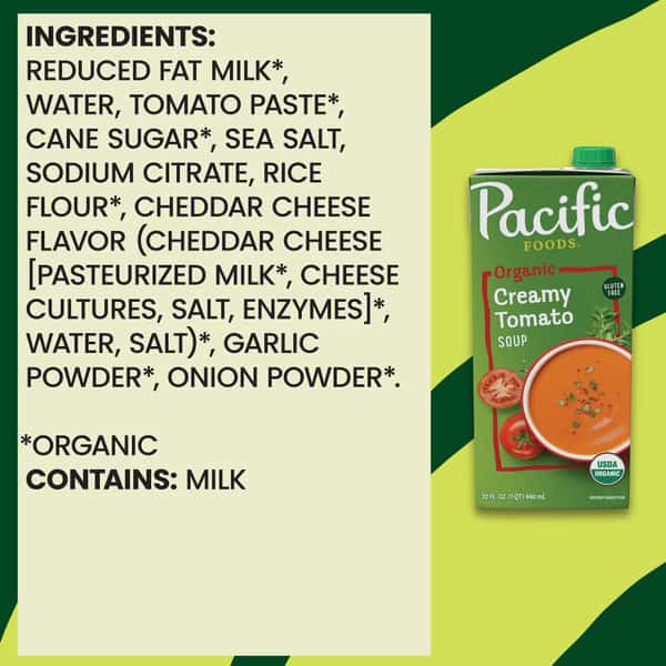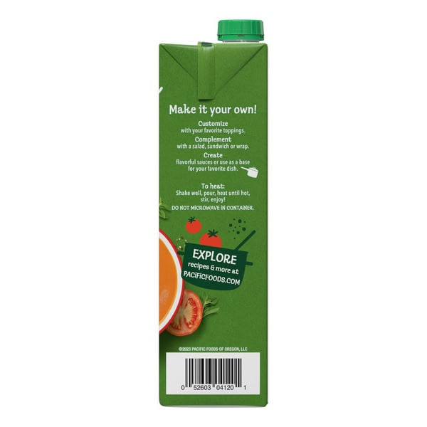 Immerse your taste buds into something truly unique with Pacific Foods® Organic Creamy Tomato Soup. This creamy organic tomato soup has rich notes of ripe tomato with the creaminess of fresh, organic milk from local dairies. A little garlic and onion round out the flavor of this gluten free soup that’s a delicious classic. Enjoy it on its own as a quick and easy vegetarian snack, customize it with your favorite toppings or pair soups with a salad, sandwich or wrap. You can also use it to create flavorful sauces or as a base for your favorite side dish. USDA Certified Organic and made with non-GMO ingredients, this kosher vegetarian soup is made with no high fructose corn syrup, artificial colors or artificial flavors. Each 32 fl oz resealable carton contains about 4 servings. To prepare, simply pour, heat until hot, stir and enjoy. Every spoonful of our sipping soup is satisfying to the last drop.
