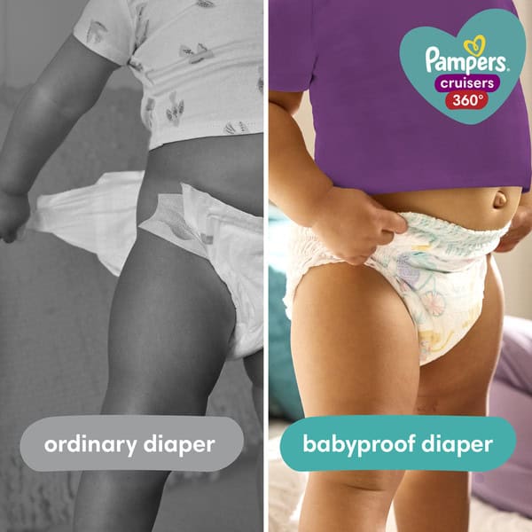 Pampers Cruisers 360 pull-on baby diapers provide our best fit and protection for your active baby at any stage. Unlike ordinary disposable diapers that gap in the back, Pampers Cruisers 360 diapers stretch comfortably around your baby’s waist and adapt to their every move for a flexible, Babyproof and gap-free fit that is up to 100% leakproof. Plus, they feature our Dual Leak-Guard Barriers that gently seal around your baby’s legs, where leaks happen most.​​​ And forget fiddling with ordinary diaper tapes! Pampers Cruisers 360 has a 360-degree stretchy waistband designed to quickly and easily pull up onto your wiggly baby. Easy for you to pull on and take off but difficult to remove for your baby.And when a diaper change is complete, we’ve made disposal simple. All you need to do is RIP the Easy-Tear Side, ROLL up the diaper, then secure it with the disposal tape that comes attached to the back. Simple as that.​​​Also, to keep your baby’s delicate skin healthy, Pampers Cruisers 360 delivers breathable dryness, pulling out wetness and locking it away from skin using our exclusive LockAway Channels. Plus, Cruisers 360 is hypoallergenic and completely free of elemental chlorine bleaching, parabens and latex.*** For trusted protection, trust Pampers to help keep your little one happy and comfy on-the-go, the #1 pediatrician recommended brand.​​**No Natural rubber