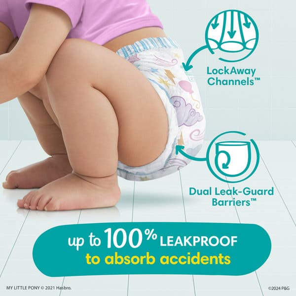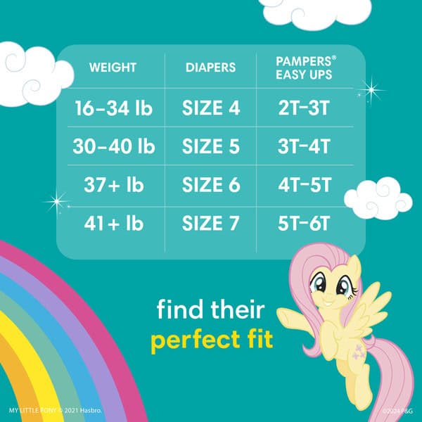 Start your potty training journey with Pampers Easy Ups Potty Training Underwear for Girls and Boys! Featuring your favorite characters – Bluey and My Little Pony – these super soft, comfortable, and breathable training pants fit just like real cotton underwear allowing your toddler to feel like they have transitioned out of diapers! With a 360 stretchy waistband that is gentle on your child’s skin, Easy Ups make it easy for your toddler to pull up and down their training pants independently. For easy changing, Easy Ups feature easy tear sides for convenience, even on the go! When it comes to potty accidents, your toddler will be covered with up to 100% leakproof protection Day OR Night. To protect where leaks happen most, Easy Ups are made with Dual Leak-Guard Barriers around the leg cuffs and Extra Absorb Channels for all around coverage to absorb accidents and lock them away from your toddler’s skin. Plus, they’re dermatologically tested, hypoallergenic, and free of parabens and latex.* That’s just one of the many reasons Pampers is the #1 pediatrician recommended brand. Toilet training is a journey and can take your toddler 90 days on average to catch on. So, Pampers Easy Ups makes it easy with each box containing a one-month supply of training pants. Available in sizes 2T-3T (16-34 lb), 3T-4T (30-40 lb), 4T-5T (37+ lb) and 5T- 6T (41+ lb).*Natural Rubber