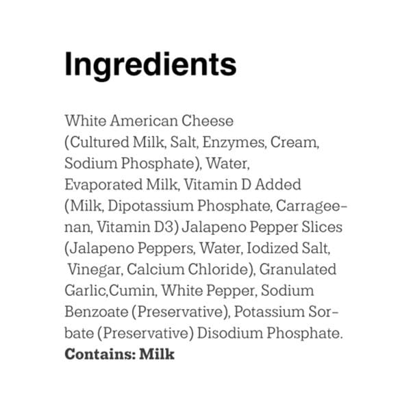 White American Cheese (Cultured Milk, Salt, Enzymes, Cream, Sodium Phosphate), Water, Evaporated Milk Vitamin D Added (Milk, Dipotassium Phosphate, Carrageenan, Vitamin D3), Jalapeno Pepper Slices (Jalapeno Peppers, Water, Iodized Salt, Vinegar, Calcium Chloride), Granulated Garlic, Cumin, White Pepper, Sodium Benzoate (Preservative), Potassium Sorbate (Preservative), Disodium Phosphate.