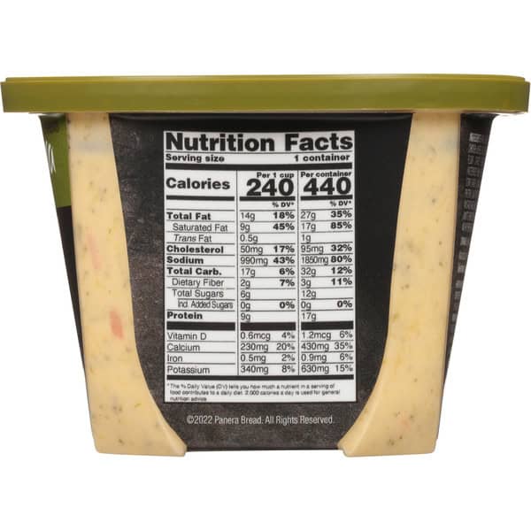 Panera Broccoli Cheddar Soup delivers a bakery-cafe inspired favorite in a microwavable cup that you can take with you on-the-go. This thick soup features chopped broccoli and shredded carrots simmered with select seasonings in a velvety smooth cheese sauce, and is made with no artificial preservatives, sweeteners or flavors. Whether you have a busy schedule and need a quick meal or you just want to enjoy a warm cup of soup, this Panera soup is perfect any time of day. To cook this packaged soup, remove the lid and film and place in the microwave, covering loosely. Heat this microwave soup cup on high for three to four minutes and stir halfway through. You can also cook this soup on the stove top to 165 degrees F, but do not boil. Store the Panera Broccoli Cheddar Soup cup in the refrigerator or freezer until you are ready to prepare. Make easy, craveable meals with help from Panera Bread at home.