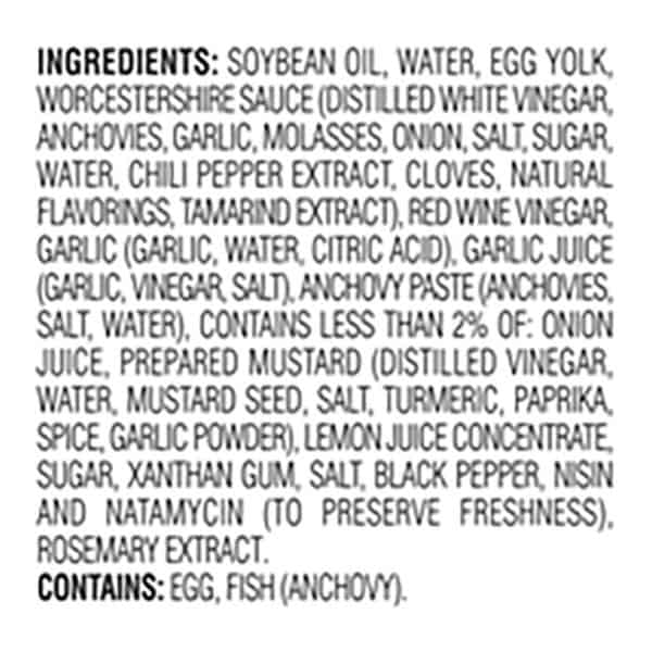 Soybean Oil, Water, Egg Yolk, Worcestershire Sauce (distilled White Vinegar, Anchovies, Garlic, Molasses, Onion, Salt, Sugar, Water, Chili Pepper Extract, Cloves, Natural Flavorings, Tamarind Extract), Red Wine Vinegar, Garlic (garlic, Water, Citric Acid), Garlic Juice (garlic, Vinegar, Salt), Anchovy Paste (anchovies, Salt, Water), Contains Less Than 2% Of Onion Juice, Mustard (distilled Vinegar, Water, Mustard Seed, Salt, Turmeric, Paprika, Spice, Garlic Powder), Lemon Juice Concentrate, Sugar, Xanthan Gum, Salt, Rosemary Extract, Nisin, Natamycin.