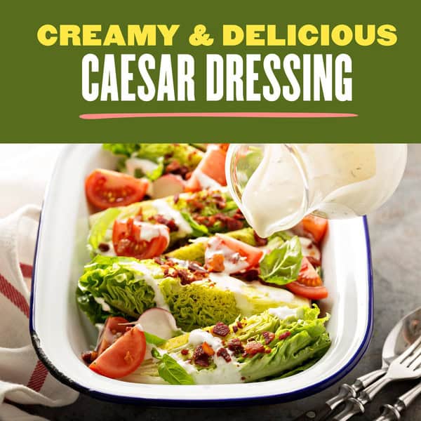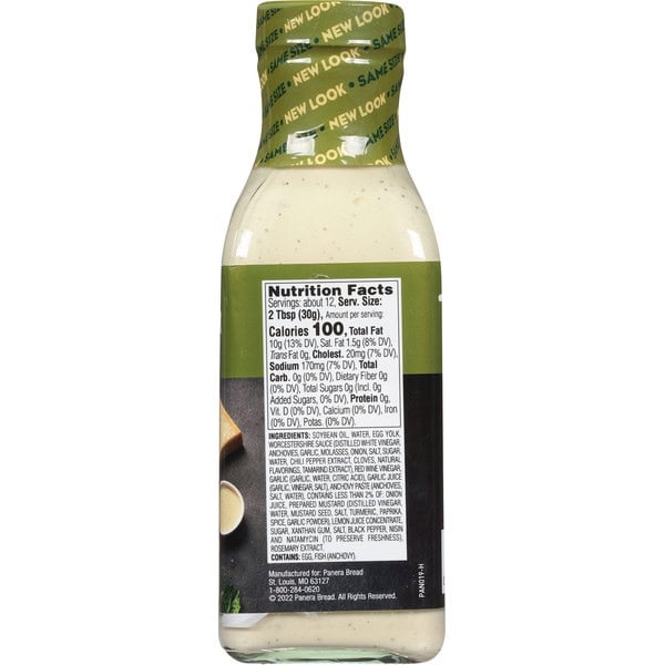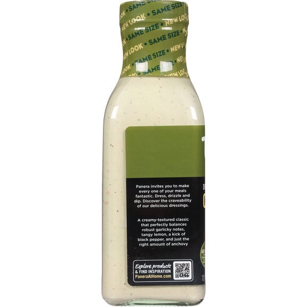 New look. Same size. Panera invites you to make every one of your meals fantastic. Dress, drizzle and dip. Discover the craveability of our delicious dressings. A creamy-textured classic that perfectly balances robust garlicky notes, tangy lemon, a kick of black pepper, and just the right amount of anchovy.