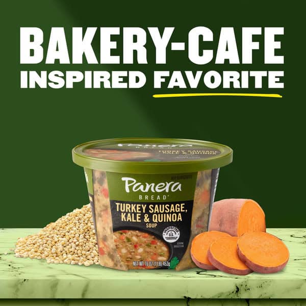 Panera Turkey Sausage, Kale & Quinoa Soup is a deliciously filling chunky soup brimming with color and flavor. This packaged soup offers a hearty medley of Italian turkey sausage, whole grains, kale and sweet potatoes simmered in a savory turkey stock. This Panera soup is gluten free, dairy free, and is made with turkey raised without antibiotics. A satisfying meal choice by itself or paired with a salad, you can enjoy a warm cup of soup at home or on the go. To cook this flavorful thick soup, remove the lid and film from the microwavable cup, cover it loosely, heat it on high for 3 to 4 minutes, and let it rest for one minute before serving. You can also pour it into a saucepan and heat it on the stovetop to 165 degrees F, but do not let it boil. Store this microwave soup cup in the refrigerator or freezer to preserve its freshness. Make easy, craveable meals with help from Panera Bread at home.