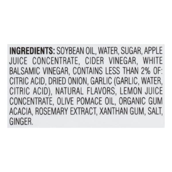 Soybean Oil, Water, Sugar, Apple Juice Concentrate, Cider Vinegar, White Balsamic Vinegar, Contains Less Than 2% Of Citric Acid, Dehydrated Onion, Garlic (garlic, Water, Citric Acid), Natural Fuji Apple Flavor (ethyl Alcohol, Water And Natural Flavor), Lemon Juice Concentrate, Olive Pomace Oil, Organic Gum Acacia, Rosemary Extract, Salt, Ginger, Xanthan Gum.