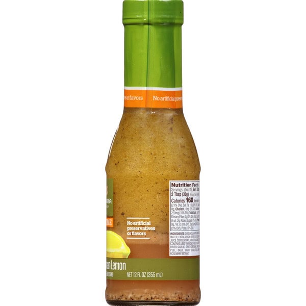 Canola Oil, White Wine Vinegar, Water, Extra Virgin Olive Oil, Sugar, Lemon Juice Concentrate, White Balsamic Vinegar, Contains Less Than 2% Of Salt, Black Pepper, Dehydrated Garlic, Dehydrated Oregano, Dehydrated Lemon Peel, Basil, Dehydrated Shallots, Lemon Oil, Rosemary Extract.