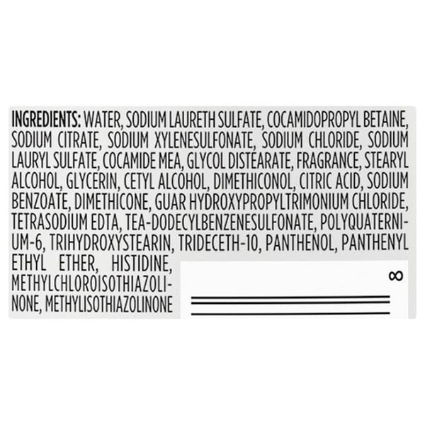 Water, Sodium Laureth Sulfate, Sodium Lauryl Sulfate, Glycol Distearte, Dimethicone, Cocami-dopropyl Betaine, Sodium Citrate, Cocamide Mea, Sodium Xylenesulfonate, Fragrance, Citric Acid, Sodium Benzoate, Guar Hydroxypropyltrimonium Chloride, Sodium Chloride, Tetrasodium Edta, Trisodium Ethylene-diamine Disuccinate, Panthenol, Panthenyl Ethyl Ether, Methylchloroisothiazolinone, Methylisothiazolinone.