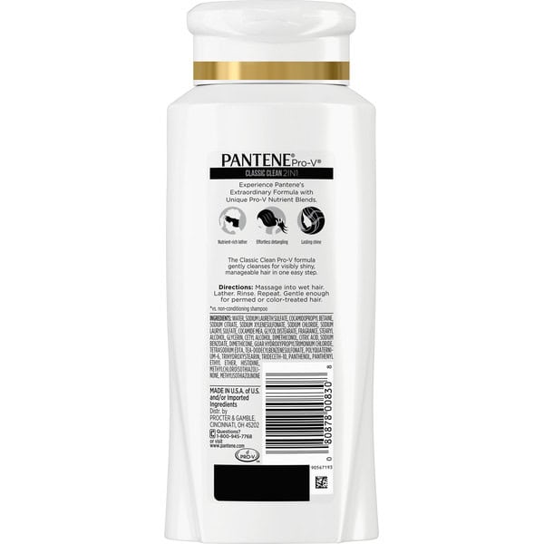 Healthier hair in 1 wash (vs. non-conditioning shampoo). Experience Pantene’s extraordinary formula with unique Pro-V nutrient blends. Nutrient-rich lather. Effortless detangling. Lasting shine. The Classic Clean Pro-V system gently cleanses for visibly shiny, manageable hair in one easy step. www.pantene.com. Questions? 1-800-945-7768 or visit www.pantene.com. Made in U.S.A. of U.S. and/or imported ingredients.