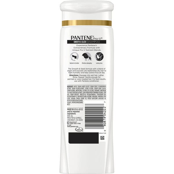 Fights frizz for 48 hrs. Experience Pantene’s extraordinary formula with unique Pro-V nutrient blends. Nutrient-rich lather. Effortless detangling. Lasting shine. The smooth & sleek formula with a blend of argan and avocado oils replenishes dry hair to fight humidity and help control frizz all day.