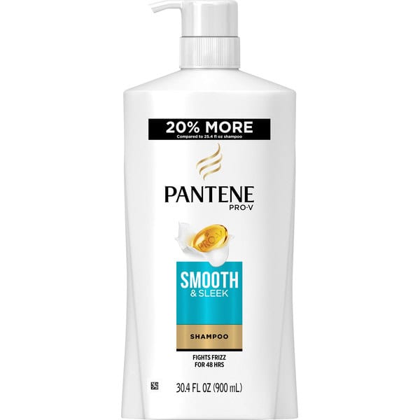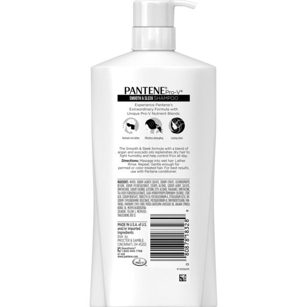 20% more compared to 25.4 fl oz shampoo. Fights frizz for 48 hrs. Experience Pantene’s extraordinary formula with unique Pro-V nutrient blends. Nutrient-rich lather. Effortless detangling. Lasting shine. The Smooth & Sleek formula with a blend of argan and avocado oils replenishes dry hair to fight humidity and help control frizz all day. Questions? 1-800-945-7768 or visit www.pantene.com. Made in USA of US and/or imported ingredients.