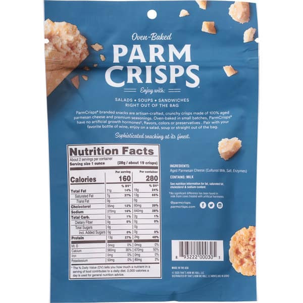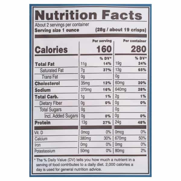 Made from 100% Aged Parmesan and Premium Seasonings. Free of preservative and artificial Colors. Gluten and Sugar Free. 9g of Protein per serving. High in Calcium, naturally Low in carbs. The finest rBST free cows in the business. Paleo and Vegetarian Friendly.