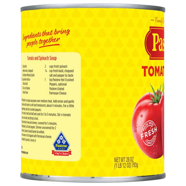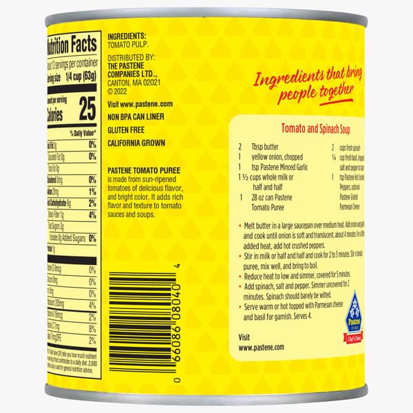 Family owned since 1874. Pastene tomato puree is made from sun-ripened tomatoes of delicious flavor, and bright color. It adds rich flavor and texture to tomato sauces and soups. Ingredients that bring people together.