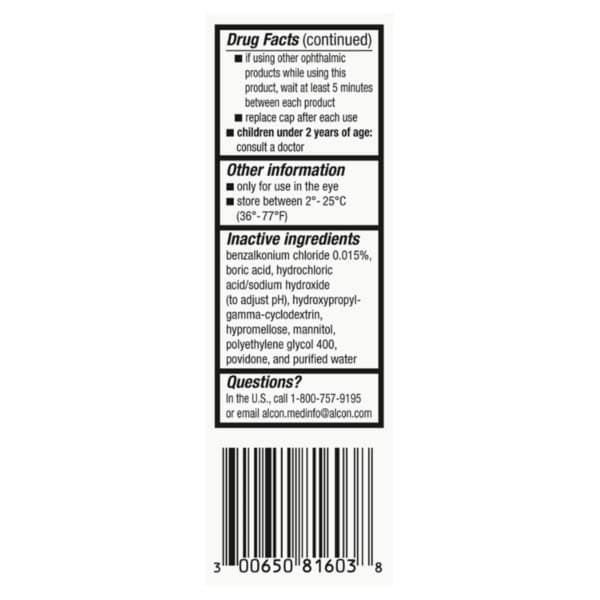 ,benzalkonium Chloride 0.015%, Boric Acid, Hydrochloric Acid/sodium Hydroxide (to Adjust Ph), Hydroxypropylgamma-cyclodextrin, Hypromellose, Mannitol, Polyethylene Glycol 400, Povidone, And Purified Water
