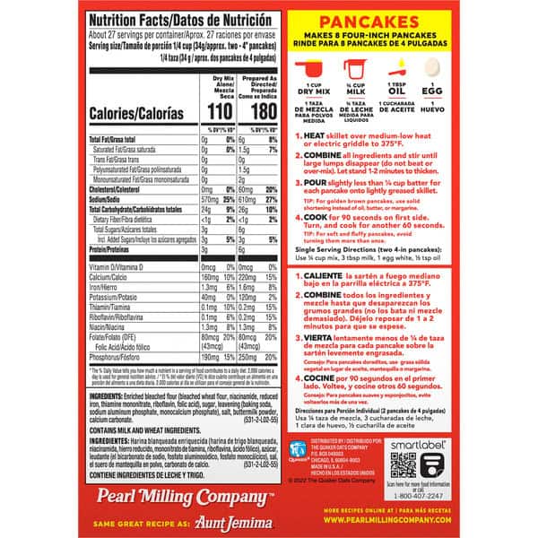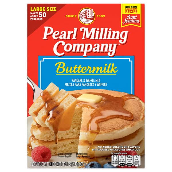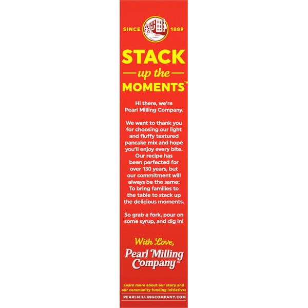 Since 1889. Large size makes about 50 pancakes. New name same great recipe. Aunt Jemima. Stack up the moments. Hi there, we’re Pearl Milling Company. We want to thank you for choosing our light and fluffy textured pancake mix and hope you’ll enjoy every bite. Our recipe has been perfected for over 130 years, but our commitment will always be the same: To bring families to the table to stack up the delicious moments. So grab a fork, pour on some syrup, and dig in! With love, Pearl Milling Company.