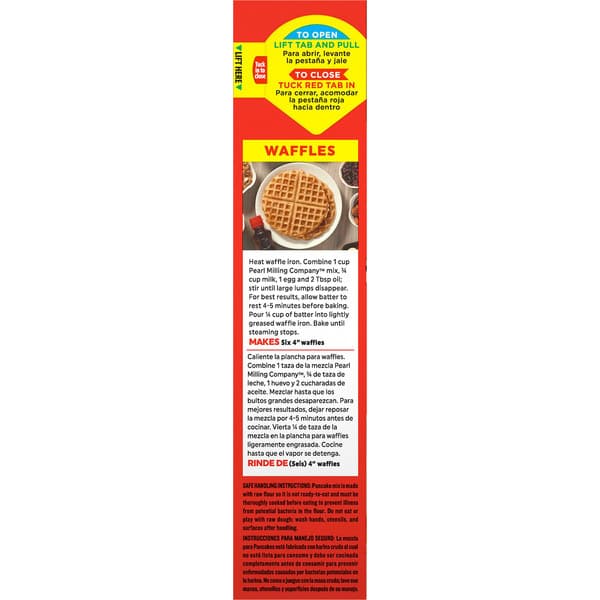 Waffles: Heat waffle iron. Combine 1 cup Pearl Milling Company mix, 3/4 cup milk, 1 egg and 2 tbsp oil; stir until large lumps disappear. For best results, allow batter to rest 4-5 minutes before baking. Pour 1/4 cup of batter into lightly greased waffle iron. Bake until steaming stops. Makes six 4 waffles. Pancakes makes 8 four-inch pancakes. 1 cup dry mix, 3/4 cup milk, 1 tbsp oil, 1 egg. 1. Heat skillet over medium-low heat or electric griddle to 375 degrees F. 2. Combine all ingredients and stir until large lumps disappear (do not beat or over-mix). Let stand 1-2 minutes to thicken. 3. Pour slightly less than 1/4 cup batter for each pancake onto lightly greased skillet. Tip: For golden brown pancakes, use solid shortening instead of oil, butter, or margarine. 4. Cook for 90 seconds on first side. Turn, and cook for another 60 seconds. Tip: For soft and fluffy pancakes, avoid turning them more than once. Single Serving Directions (two 4-in pancakes): Use 1/4 cup mix, 3 tbsp milk, 1 egg white, 1/2 tsp oil.