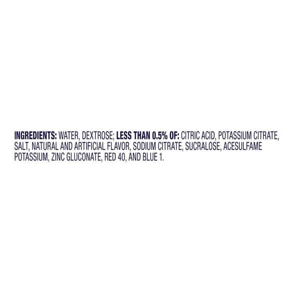 Water, Dextrose, Less Than 0.5% Of: Citric Acid, Potassium Citrate, Salt, Natural And Artificial Flavors, Sodium Citrate, Sucralose, Acesulfame Potassium, Zinc Gluconate, Red 40 And Blue 1