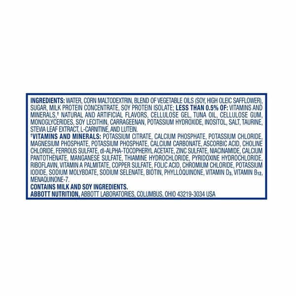 Water, Corn Maltodextrin, Sugar, Blend Of Vegetable Oils (canola And Corn), Milk Protein Concentrate, Soy Protein Isolate, Nonfat Milk; Less Than 0.5% Of: Natural And Artificial Flavor, Cellulose Gel, Potassium Chloride, Magnesium Phosphate, Calcium Phosphate, Potassium Citrate, Tuna Oil, Calcium Carbonate, Potassium Phosphate, Choline Chloride, Ascorbic Acid, Monoglycerides, Soy Lecithin, Cellulose Gum, Salt, Carrageenan, Potassium Hydroxide, Inositol, Taurine, Stevia Leaf Extract, Ferrous Sulfate, Monk Fruit Extract, Di-alpha-tocopheryl Acetate, L-carnitine, Zinc Sulfate, Calcium Pantothenate, Niacinamide, Manganese Sulfate, Thiamine Hydrochloride, Pyridoxine Hydrochloride, Riboflavin, Lutein, Copper Sulfate, Vitamin A Palmitate, Folic Acid, Chromium Chloride, Biotin, Potassium Iodide, Sodium Selenate, Sodium Molybdate, Phylloquinone, Vitamin D3 And Vitamin B12.