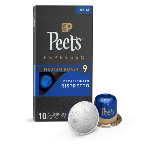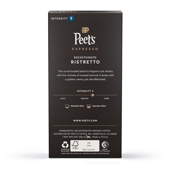 Peet’s Decaffeinato Ristretto Espresso Intensity 9 Medium Roast Decaffeinated Coffee is a round-bodied blend, fragrant and velvety with the richness of toasted almond. It’s all the boldness you love from Peet’s espresso, just without the caffeine. Peet’s Espresso is available in a convenient aluminum capsule that is compatible with Nespresso Original machines*. Made with 100% Arabica coffee, each capsule delivers the rich, high-quality coffee experience that you expect from Peet’s. Plus, the aluminum capsules are recyclable through our mail-back program. Each capsule is sealed to preserve aromas and deliver a more intense espresso experience and a richer, smoother, and creamier foam. They offer stable brewing, an exact pull, and more consistent interaction with brewers. Peet’s Espresso Capsules are compatible with the Essenza Mini, Essenza Plus, Pixie, CitiZ, Lattissima, KitchenAid, and Creatista Nespresso Original machines*. Our capsules are not compatible with Nespresso Vertuo machines*.