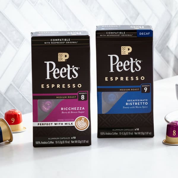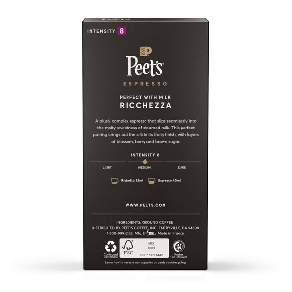 Peet’s Ricchezza Espresso Intensity 8 Medium Roast Coffee is a plush, complex espresso that slips seamlessly into the malty sweetness of steamed milk. This perfect pairing brings out the silk in its fruity finish, with layers of blossom, berry and brown sugar. Peet’s Espresso is available in a convenient aluminum capsule that is compatible with Nespresso Original machines*. Made with 100% Arabica coffee, each capsule delivers the rich, high-quality coffee experience that you expect from Peet’s. Plus, the aluminum capsules are recyclable through our mail-back program. Each capsule is sealed to preserve aromas and deliver a more intense espresso experience and a richer, smoother, and creamier foam. They offer stable brewing, an exact pull, and more consistent interaction with brewers. Peet’s Espresso Capsules are compatible with the Essenza Mini, Essenza Plus, Pixie, CitiZ, Lattissima, KitchenAid, and Creatista Nespresso Original machines*. Our capsules are not compatible with Nespresso Vertuo machines*.