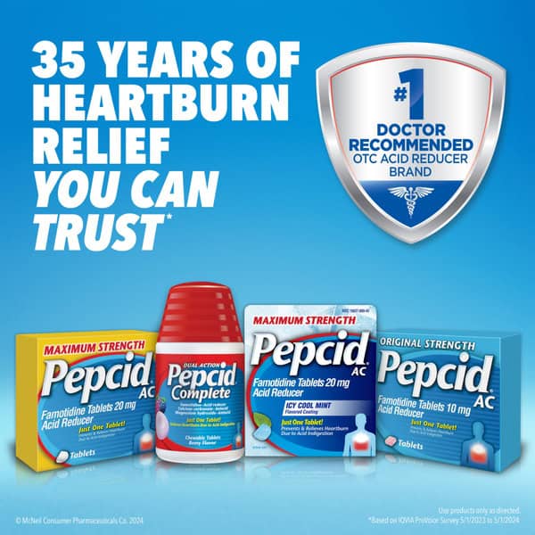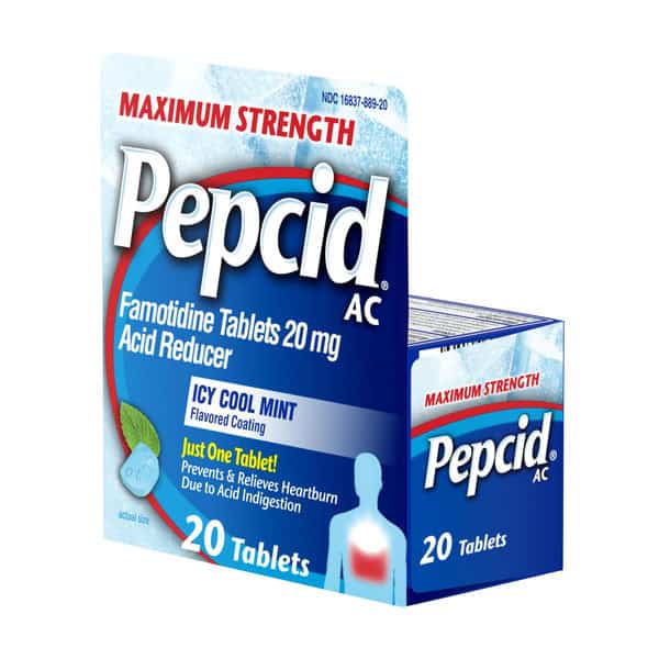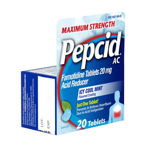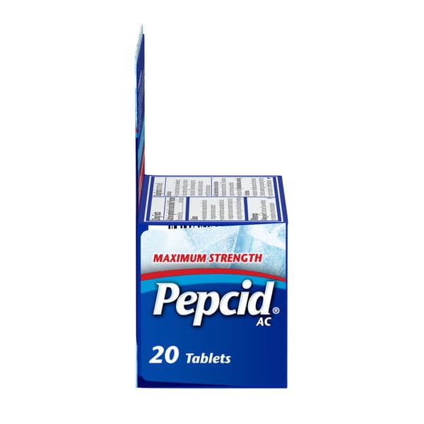 Maximum Strength Pepcid AC Heartburn Relief Tablets with famotidine & an icy mint flavored coating provide fast-acting prevention & relief of heartburn associated with acid indigestion & sour stomach. Each maximum strength acid reducer tablet is formulated with 20 mg of famotidine, a known acid reducer that relieves heartburn brought on by eating or drinking certain food & beverages. Keep a package of the heartburn medicine in your bag to treat heartburn on-the-go. You can take just one Maximum Strength Pepcid AC for indigestion relief as little as 10 minutes before eating, & know you have acid control on your side all day or all night.†* Adults & children 12+, swallow 1 tablet with a glass of water to relieve symptoms; do not chew. Do not take more than 2 tablets in 24 hours. †Prevents heartburn if taken 10 to 60 minutes before a meal. *Based on 9-hour acid control studies during the day & 12-hour acid control studies during the night. Acid control does not imply symptom relief.