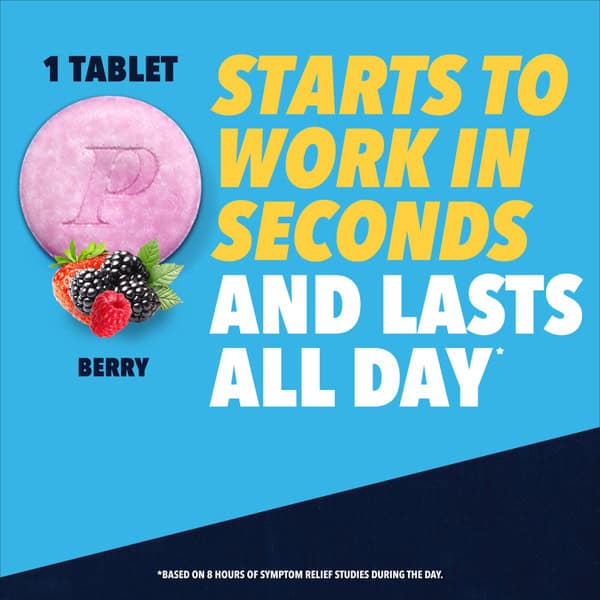 Quickly relieve heartburn & reduce acid associated with acid indigestion & sour stomach with Pepcid Complete Acid Reducer + Antacid Chewable Tablets. These berry flavored heartburn medicine + antacid chews combine a fast-working antacid & long-lasting acid reducer to help control acid all day or night.* Formulated with 10 mg of the acid reducer famotidine, 800 mg of the antacid calcium carbonate & 165 mg of the antacid magnesium hydroxide per tablet, this heartburn reliever helps to neutralize & control acid. The dual-action formula of these antacid chews starts working in seconds & lasts longer than Tums.*† Whether at brunch or a new food spot, use Pepcid Complete Berry Flavored Chews for fast-acting heartburn relief so you don’t have to worry about heartburn getting in the way. * Based on 9-hour acid control studies during the day & 12-hour acid control studies during the night. Acid control does not imply symptom relief. *† Tums is a registered trademark of GlaxoSmithKline.