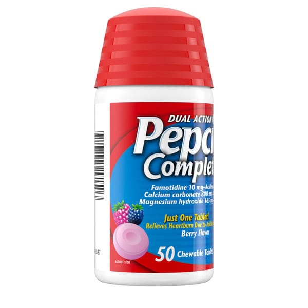 • Berry flavored Pepcid Complete Acid Reducer + Antacid Chewable Tablets for heartburn relief