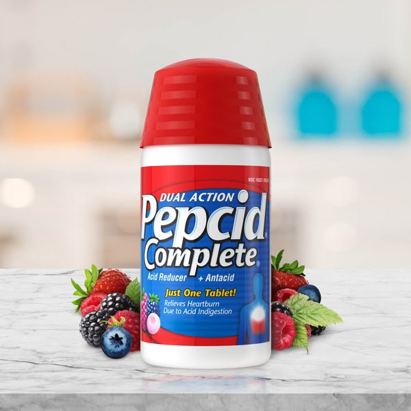 • Berry flavored Pepcid Complete Acid Reducer + Antacid Chewable Tablets for heartburn relief