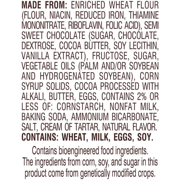 Enriched Wheat Flour (flour, Niacin, Reduced Iron, Thiamine Mononitrate, Riboflavin, Folic Acid), Semi Sweet Chocolate (sugar, Chocolate, Dextrose, Cocoa Butter, Soy Lecithin, Vanilla Extract), Fructose, Sugar, Vegetable Oils (palm And/or Soybean And Hydrogenated Soybean), Corn Syrup Solids, Cocoa Processed With Alkali, Butter, Eggs, Contains 2% Or Less Of: Cornstarch, Nonfat Milk, Baking Soda, Ammonium Bicarbonate, Salt, Cream Of Tartar, Natural Flavor