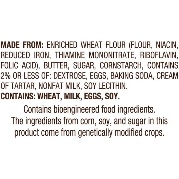 Enriched Wheat Flour (flour, Niacin, Reduced Iron, Thiamine Mononitrate, Riboflavin, Folic Acid), Butter, Sugar, Cornstarch, Contains 2% Or Less Of: Dextrose, Eggs, Baking Soda, Cream Of Tartar, Nonfat Milk, Soy Lecithin