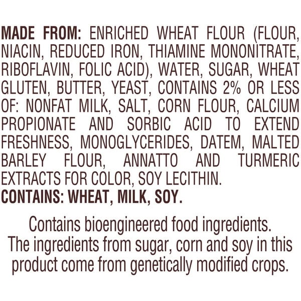 Enriched Wheat Flour (flour, Niacin, Reduced Iron, Thiamine Mononitrate, Riboflavin, Folic Acid), Water, Sugar, Wheat Gluten, Butter, Yeast, Contains 2% Or Less Of Nonfat Milk, Salt, Corn Flour, Calcium Propionate And Sorbic Acid To Extend Freshness, Monoglycerides, Datem, Malted Barley Flour, Annatto And Turmeric Extracts For Color, Soy Lecithin