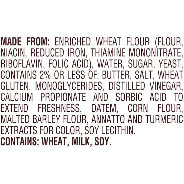 Enriched Wheat Flour (flour, Niacin, Reduced Iron, Thiamine Mononitrate, Riboflavin, Folic Acid), Water, Sugar, Yeast, Contains 2% Or Less Of: Butter, Salt, Wheat Gluten, Monoglycerides, Distilled Vinegar, Calcium Propionate And Sorbic Acid To Extend Freshness, Datem, Corn Flour, Malted Barley Flour, Annatto And Turmeric Extracts For Color, Soy Lecithin