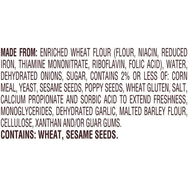 Made From: Enriched Wheat Flour (flour, Niacin, Reduced Iron, Thiamine Mononitrate, Riboflavin, Folic Acid), Water, Dehydrated Onions, Sugar, Contains 2% Or Less Of Corn Meal, Yeast, Sesame Seeds, Poppy Seeds, Wheat Gluten, Salt, Calcium Propionate And Sorbic Acid To Extend Freshness, Monoglycerides, Dehydrated Garlic, Malted Barley Flour, Cellulose, Xanthan And/or Guar Gums.