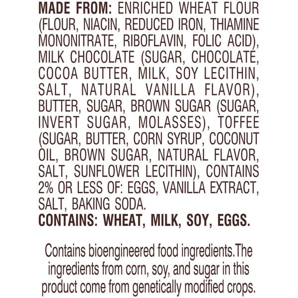 Enriched Wheat Flour (flour, Niacin, Reduced Iron, Thiamine Mononitrate, Riboflavin, Folic Acid), Milk Chocolate (sugar, Chocolate, Cocoa Butter, Milk, Soy Lecithin, Salt, Natural Vanilla Flavor), Butter, Sugar, Brown Sugar (sugar, Invert Sugar, Molasses), Toffee (sugar, Butter, Corn Syrup, Coconut Oil, Brown Sugar, Natural Flavor, Salt, Sunflower Lecithin), Contains 2% Or Less Of: Eggs, Vanilla Extract, Salt, Baking Soda