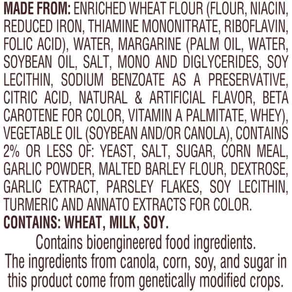 Enriched Wheat Flour (flour, Niacin, Reduced Iron, Thiamine Mononitrate, Riboflavin, Folic Acid), Water, Margarine (palm Oil, Water, Soybean Oil, Salt, Natural Flavor (milk), Soy Lecithin, Beta Carotene (color), Vitamin A Palmitate Added). Soybean Oil, Contains 2 Percent Or Less Of: Yeast, Salt, Sugar, Yellow Corn Meal, Garlic Powder, Malted Barley Flour, Garlic Extract, Parsley Flakes, Soy Lecithin, Wheat Gluten, Annatto And Turmeric Extracts For Color.